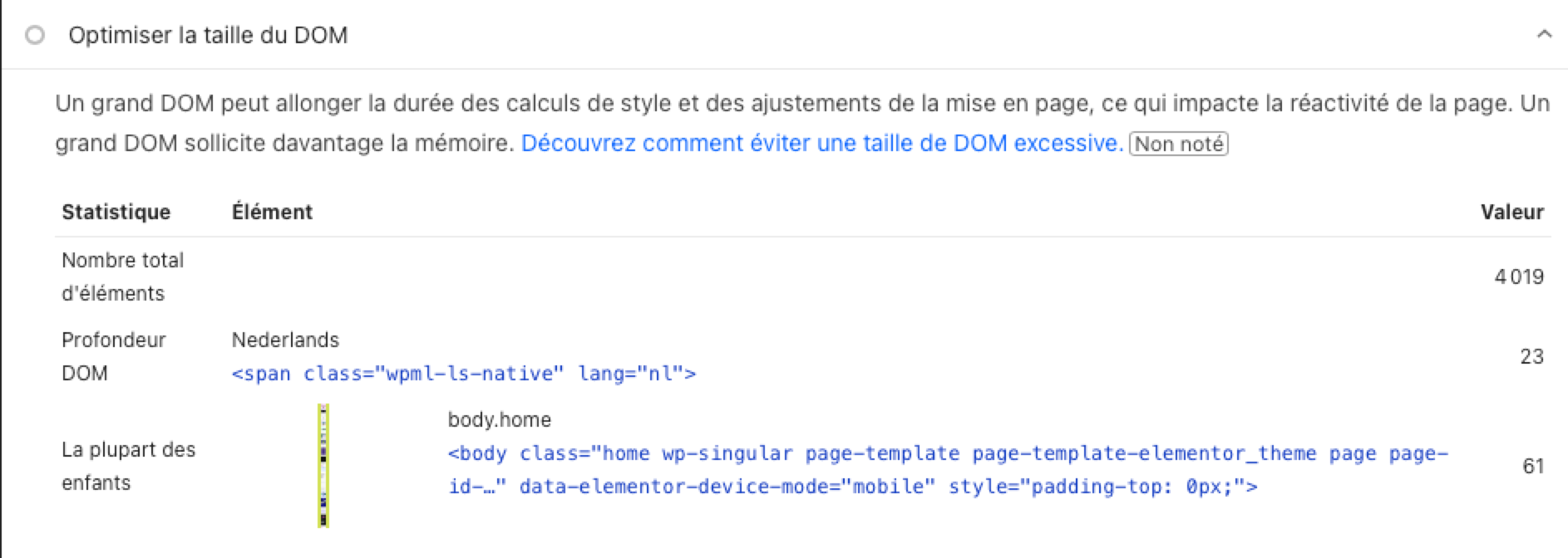 L'Insight Optimiser la taille du DOM détecte si une page Web possède un Modèle Objet de Document (Document Object Model en anglais, abrégé DOM) excessivement volumineux et indique le nombre total d'éléments DOM d'une page, la profondeur maximale du DOM de la page et l'élément comportant le plus grand nombre d'éléments enfants.