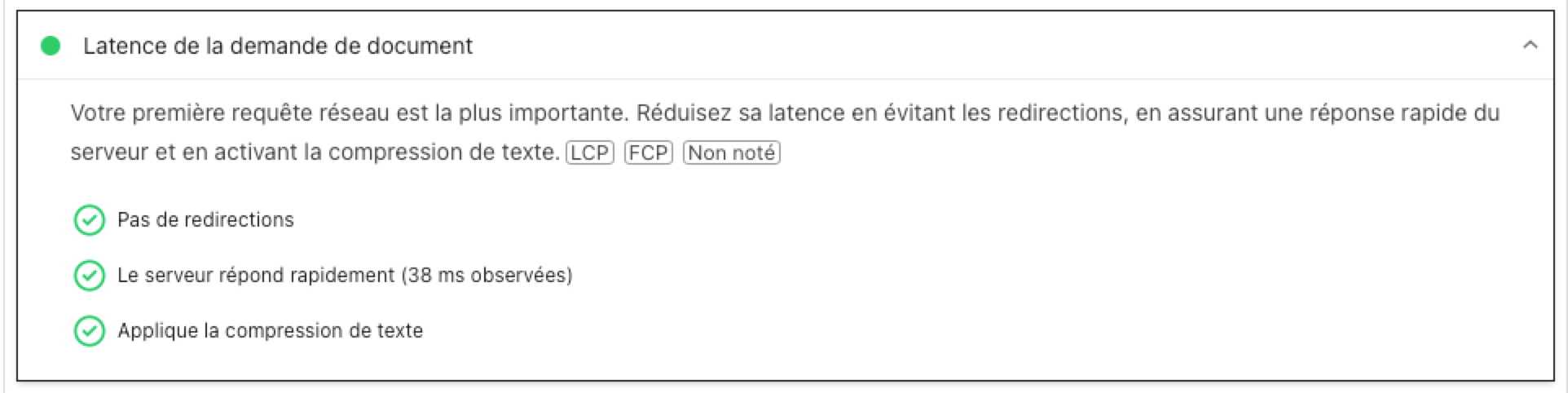 L'audit de latence des requêtes de documents mesure le temps nécessaire pour demander et télécharger le document HTML initial d'une page. Cette valeur est cruciale, car le navigateur ne peut pas commencer à afficher ou à charger d'autres ressources tant qu'il n'a pas reçu le HTML. Il mesure principalement : la redirection de page, le temps de réponse initial du serveur, la compression de texte, afin d'identifier les goulots d'étranglement.